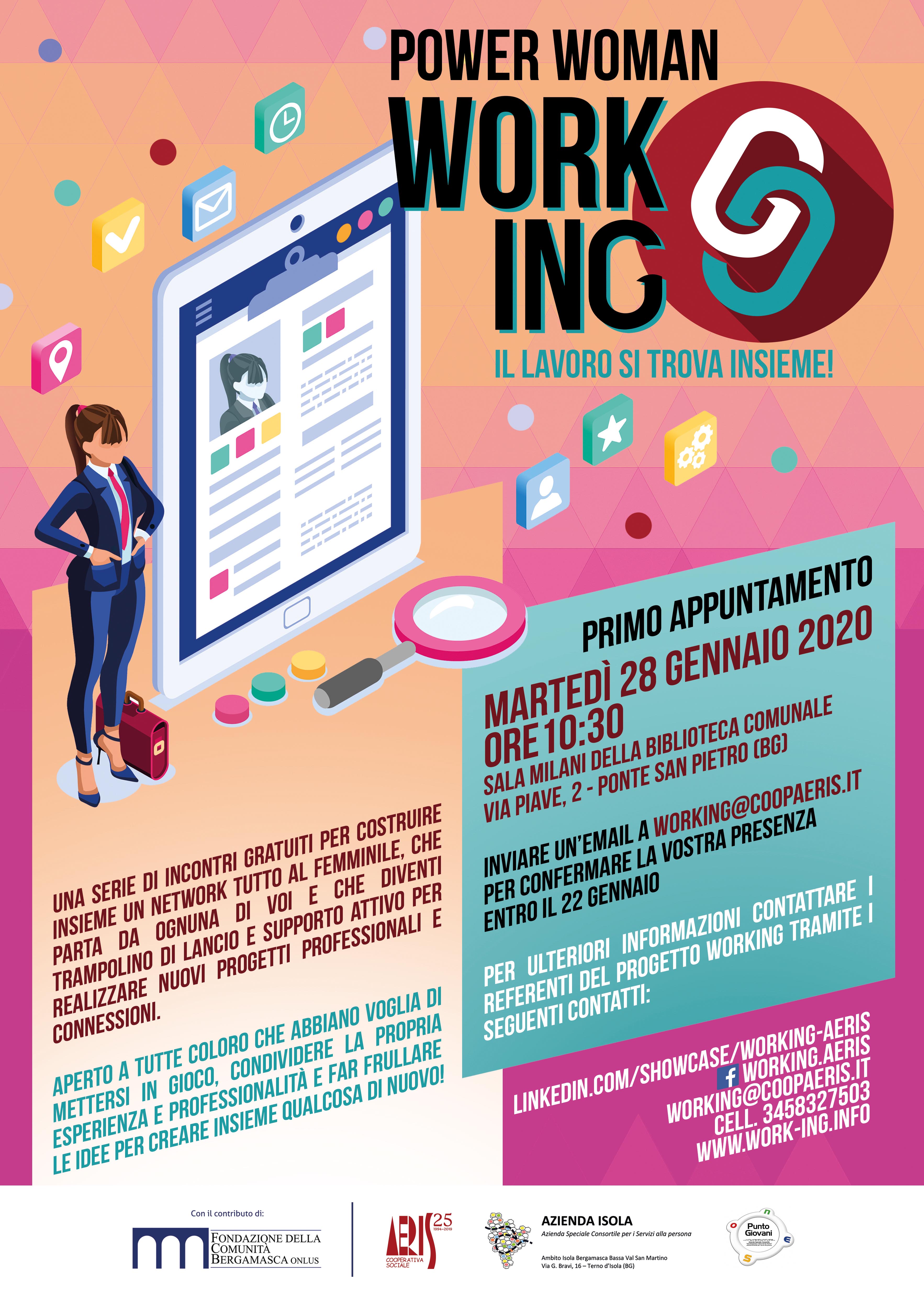 - “Power Woman”: il network al femminile sul lavoro, primo appuntamento il 28 gennaio 2020 alle 10:30 presso Sala Milani, Ponte San Pietro. In allegato locandina.