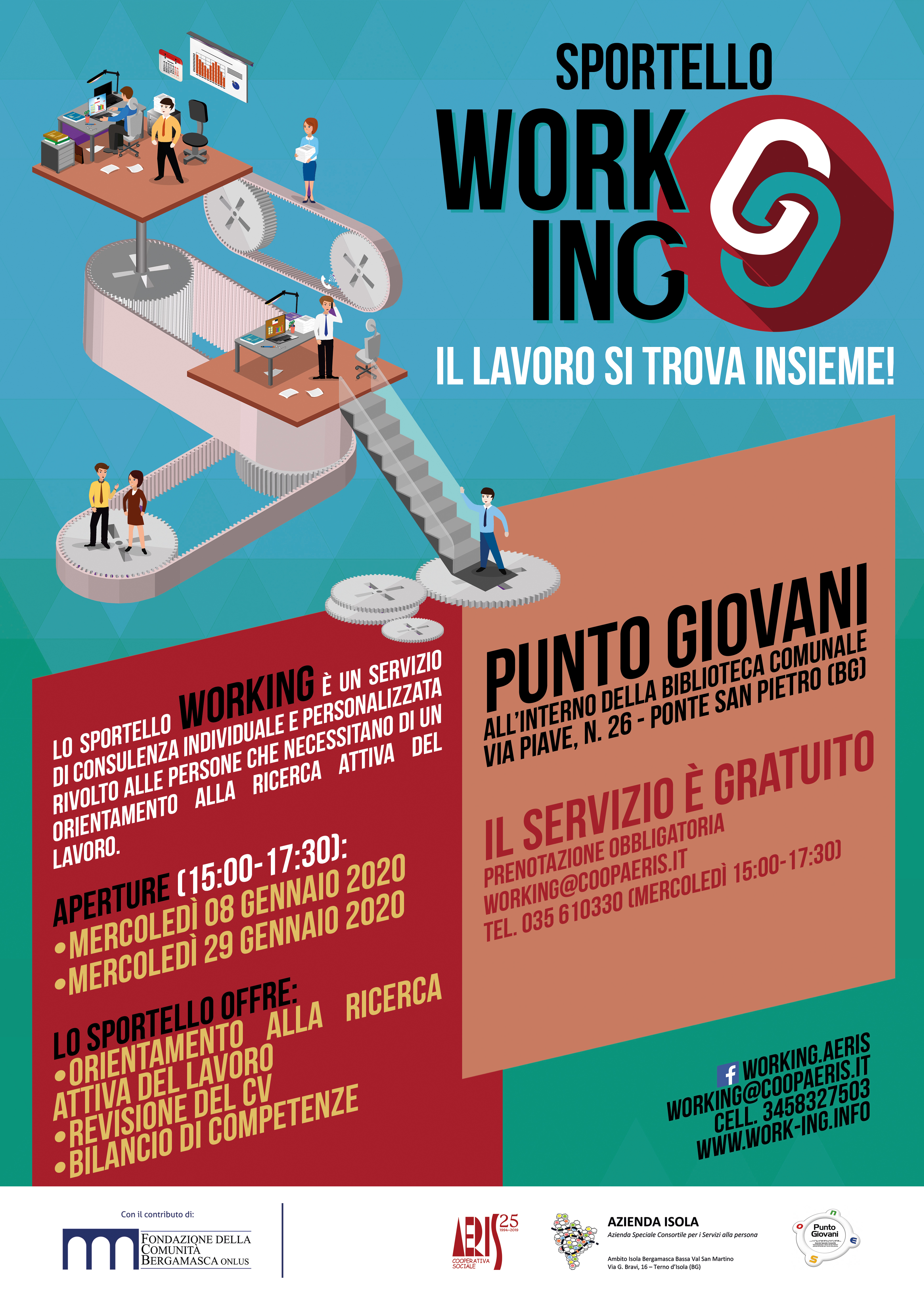 - “Sportello Working”: l’08 e 29 gennaio 2020 dalle 15:00 alle 17:30 presso il Punto Giovani di Ponte San Pietro. In allegato locandina.