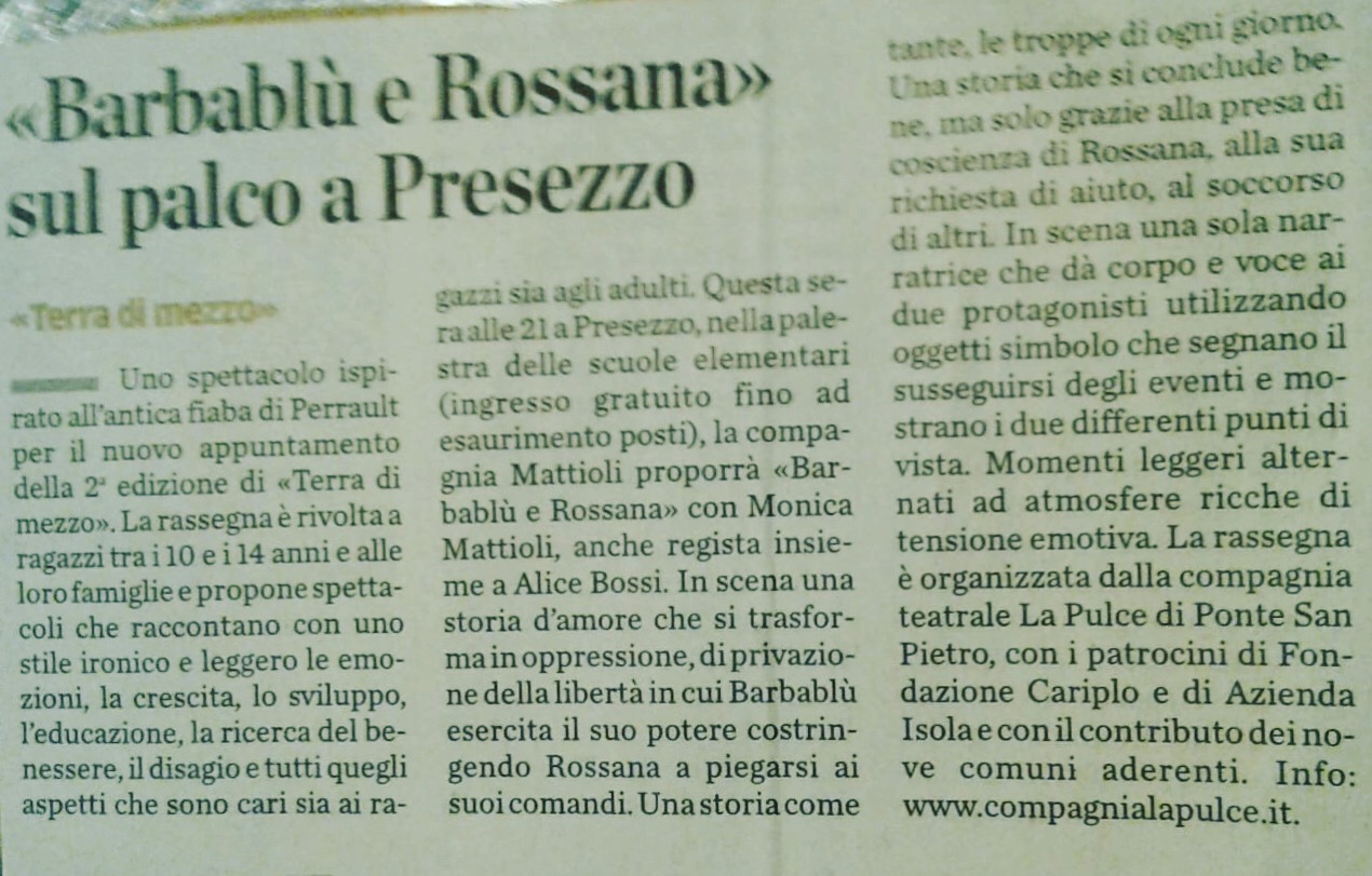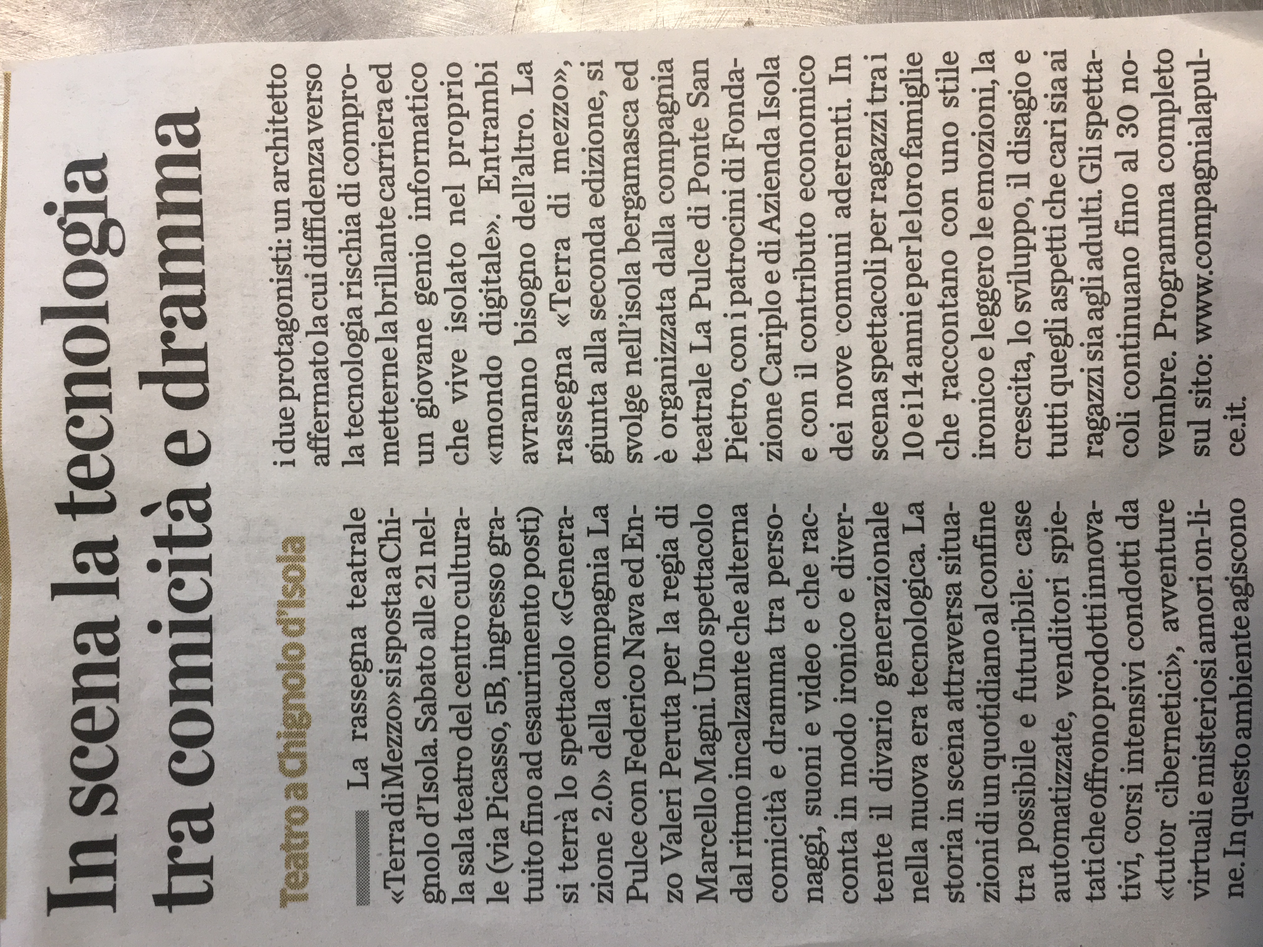 Il 5 ottobre 2019 avrà inizio la seconda edizione della Rassegna Teatrale “TERRA DI MEZZO”, organizzata dalla Compagnia Teatrale La Pulce di Ponte San Pietro, con i Patrocini di Fondazione Cariplo e di Azienda Isola e il contributo economico dei Comuni aderenti.