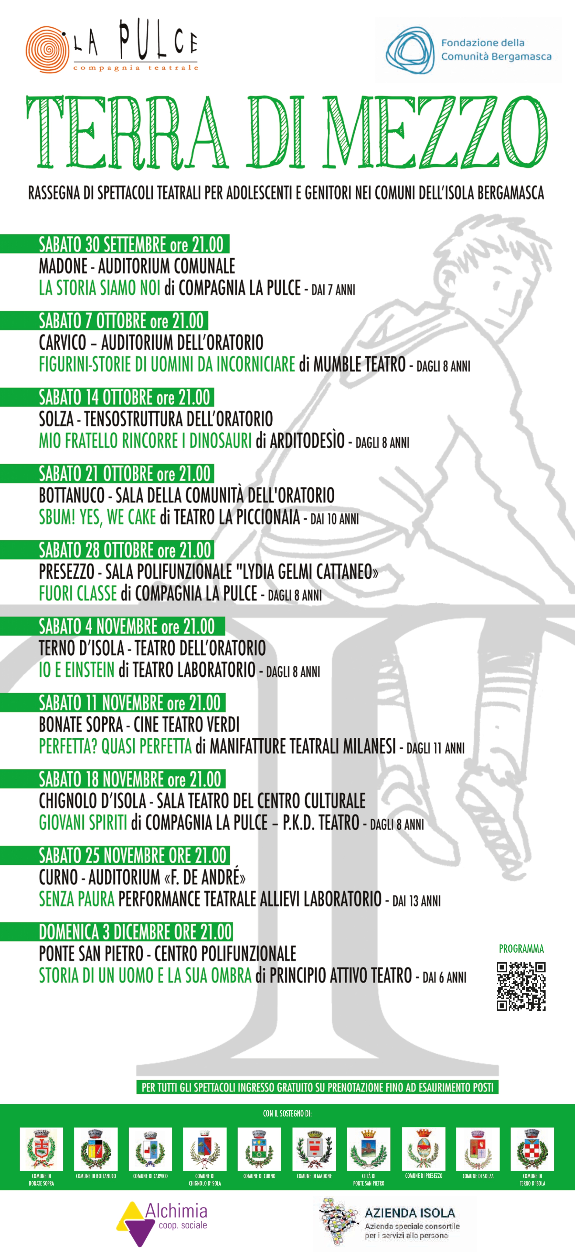 Il 30 settembre 2023 avrà inizio la sesta edizione della Rassegna Teatrale “TERRA DI MEZZO”, organizzata dalla Compagnia Teatrale La Pulce di Ponte San Pietro, grazie ai contributi di Azienda Isola, Fondazione della Comunità Bergamasca, Cooperativa Sociale Alchimia e al sostegno economico dei Comuni aderenti.